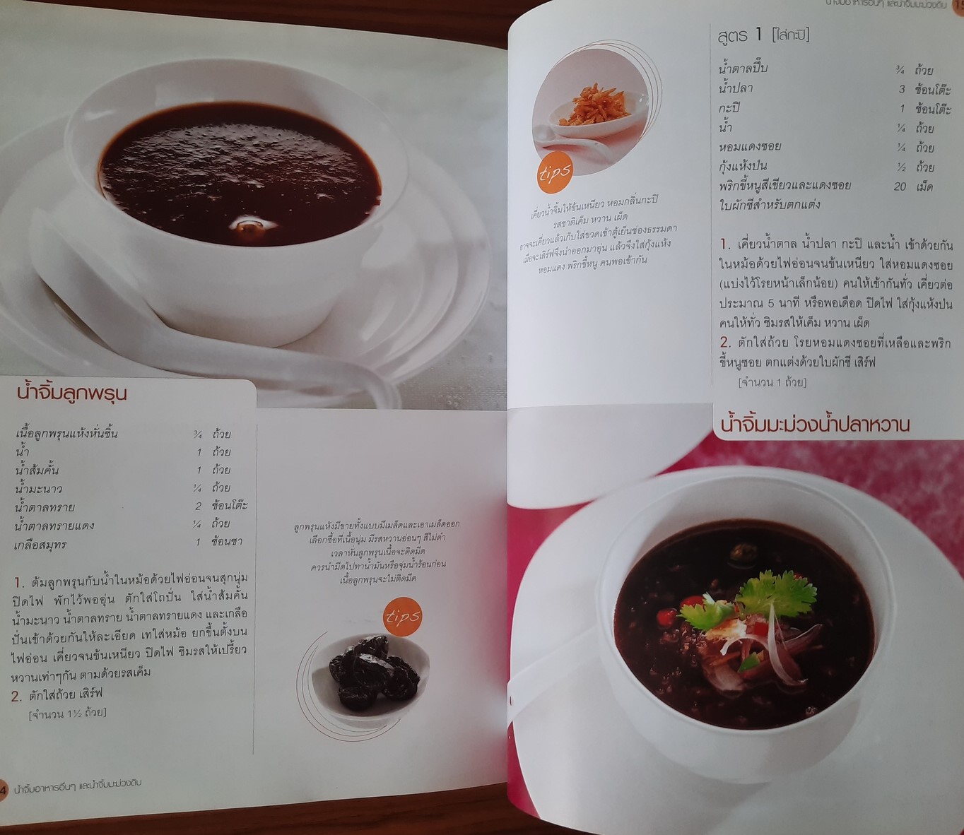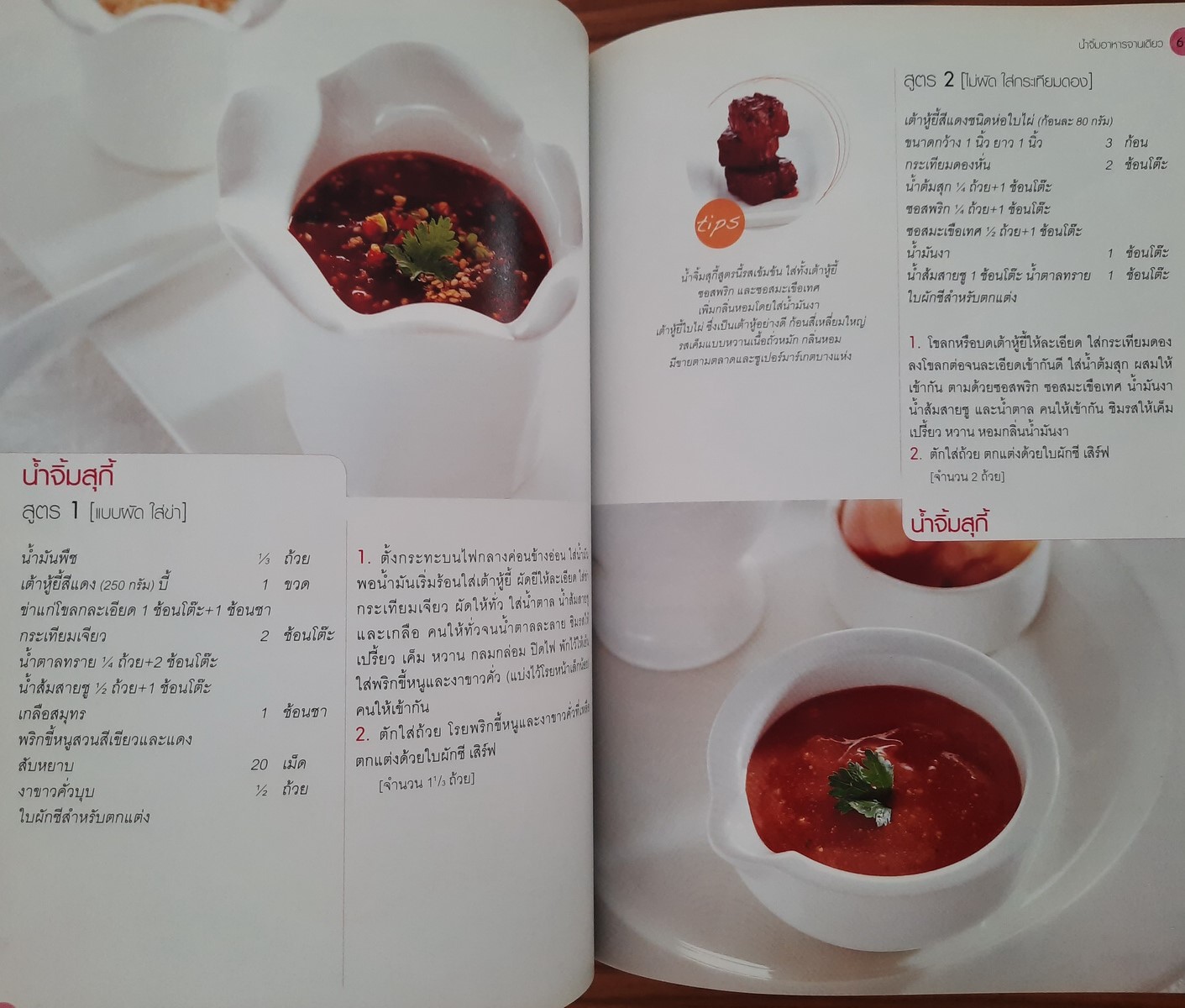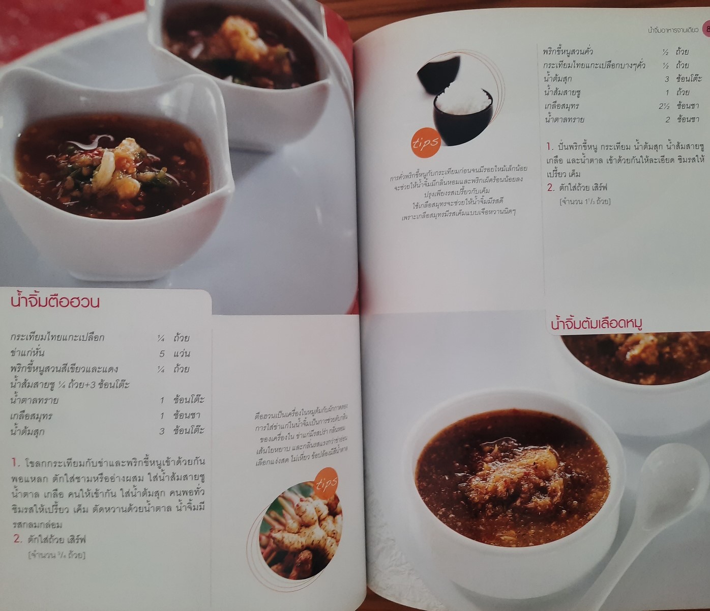 ในเล่มน้ำจิ้มนี้ มีน้ำจิ้มมากถึง 121 สูตร เรียกว่ามีน้ำจิ้มครบทุกจานอาหาร นับตั้งแต่อาหารทะเล อาหารจานเดียวหลายอย่าง อาหารทอดและอาหารว่าง อาหารนึ่งและหม้อไฟ อาหารปิ้งย่าง และน้ำปลาหวานจิ้มมะม่วงดิบรสเปรี้ยวสารพัดชนิด ไม่เว้นแม้แต่น้ำจิ้ม ตือคาโคว มันแขก และน้ำจิ้มบ๊วยเจี่ยที่ใช้จิ้มกับแฮ่กึ๊น ฮ่อยจ๊อ
