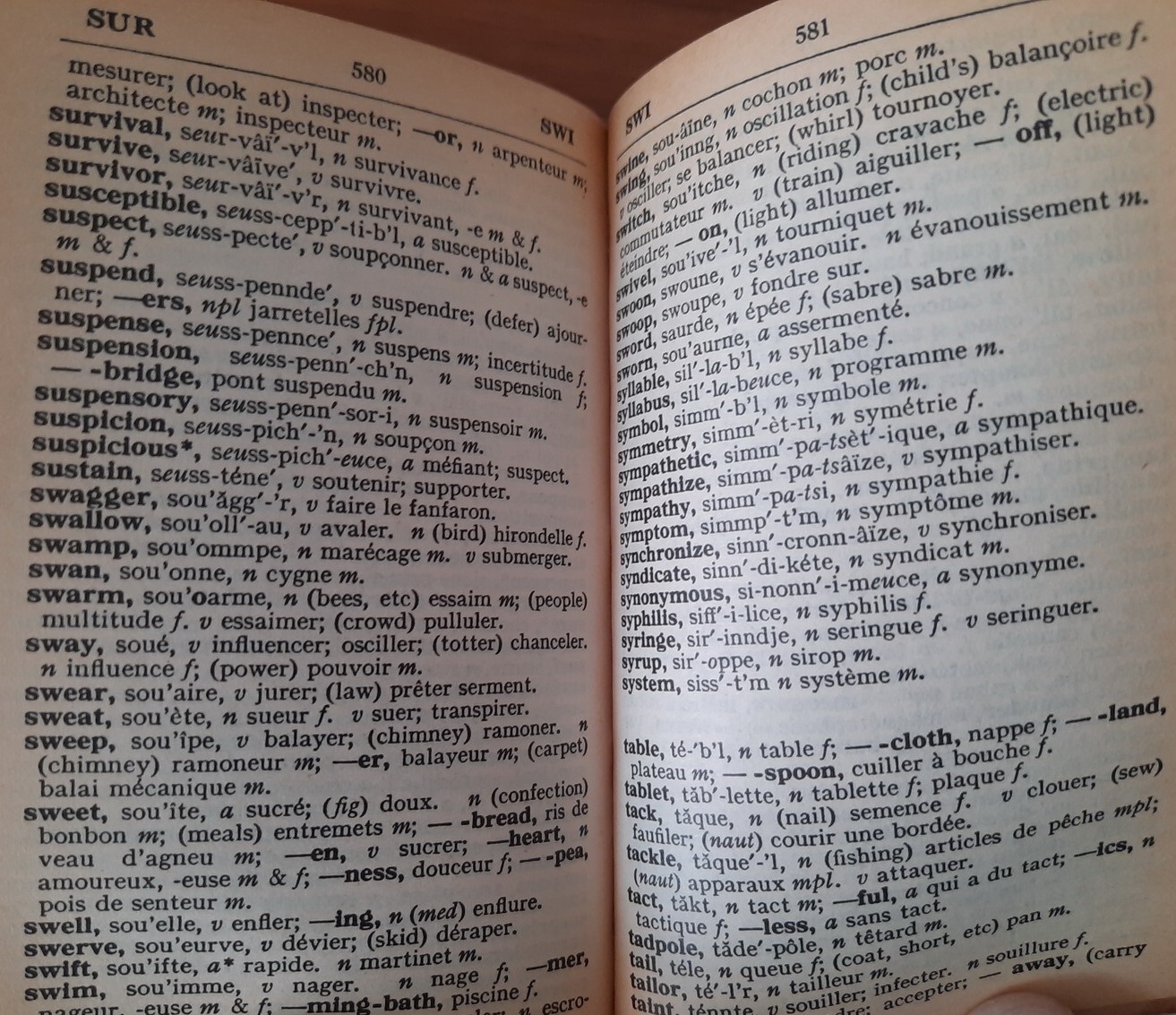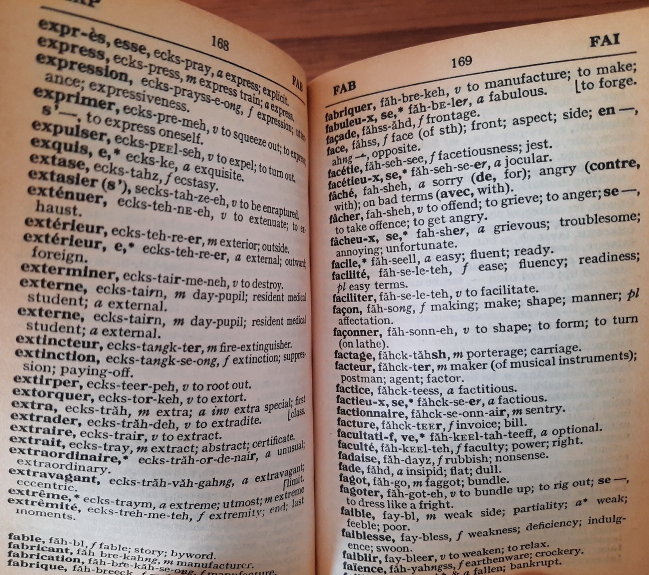 คำศัพท์ที่มีรากศัพท์เดียวกันซึ่งไม่ได้ระบุไว้ในภาคฝรั่งเศส–อังกฤษ โดยทั่วไปจะสามารถค้นพบได้ในภาคอังกฤษ–ฝรั่งเศส แนวทางการจัดทำเช่นนี้มีขึ้นเพื่อประหยัดพื้นที่และบรรจุคำศัพท์ให้ได้มากที่สุดเท่าที่จะเป็นไปได้