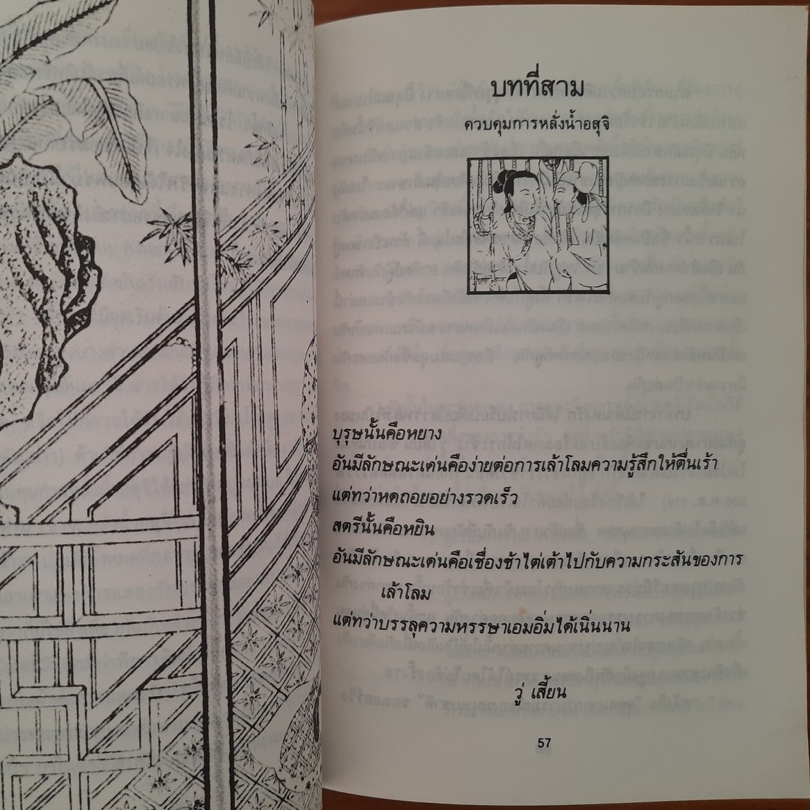 เป็นหนังสือที่เรียกร้องให้ผู้ชายที่มีความสัมพันธ์กับผู้หญิงตั้งอยู่บนเงื่อนไขแห่งความรัก การเห็นคุณค่าในความเป็นคนผู้เสริมส่งตนเอง เป็นหนังสือที่ช่วยให้ผู้ชายใช้ประโยชน์จากความรักการร่วมเพศให้เป็นประโยชน์ต่อสุขพลานามัยของตนเอง และใช้ชีวิตอย่างเรียบง่าย ดุจเดียวกับวิถีแห่งเต๋า