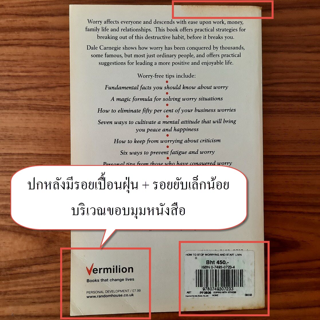 (2) ปกหลัง มีรอยยับ + รอยเปื้อนฝุ่นเล็กน้อยบริเวณขอบมุมหนังสือ รายละเอียดตามภาพ