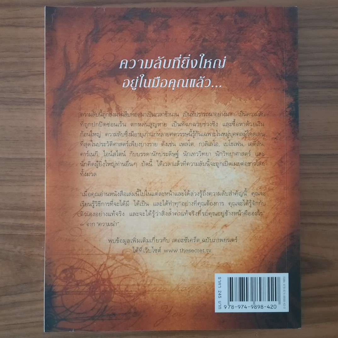 "ความลับที่ยิ่งใหญ่อยู่ในมือคุณแล้ว" ความลับนี้ถูกส่งผ่านสืบทอดมาเป็นเวลาช้านาน เป็นที่ปรารถนาอย่างมาก เป็นความลับที่ถูกปิดซ่อนเร้น ตกหล่นสูญหาย เป็นที่ฉกฉวยช่วงชิง และซื้อหาด้วยเงินก้อนใหญ่ ความลับซึ่งมีอายุเก่าแก่หลายศตวรรษนี้รู้กันเฉพาะในหมู่บุคคลผู้โดดเด่นที่สุดในประวัติศาสตร์เพียงบางราย ดังเช่น เพลโต, กาลิเลโอ, เบโธเฟน, เอดิสัน, คาร์เนกี, ไอน์สไตส์ กับบรรดานักประดิษฐ์ นักเทววิทยา นักวิทยาศาสตร์ และนักคิดผู้ยิ่งใหญ่ท่านอื่นๆ บัดนี้ ได้เวลาแล้วที่ความลับนี้จะถูกเปิดเผยต่อชาวโลกทั้งมวล