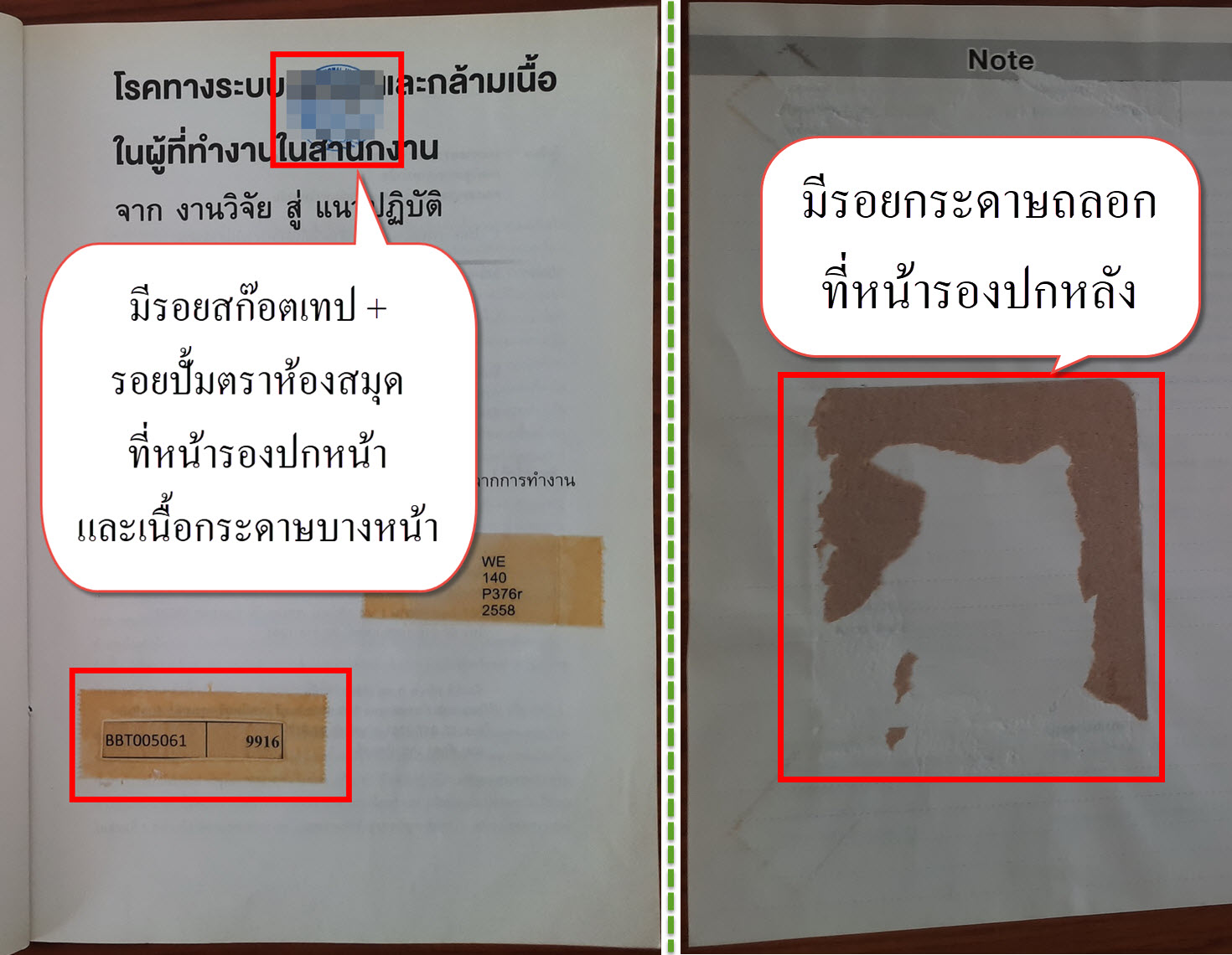 (2) มีรอยปั้มตราห้องสมุดที่สันหนังสือ และเนื้อกระดาษบางหน้า รายละเอียดตามภาพ