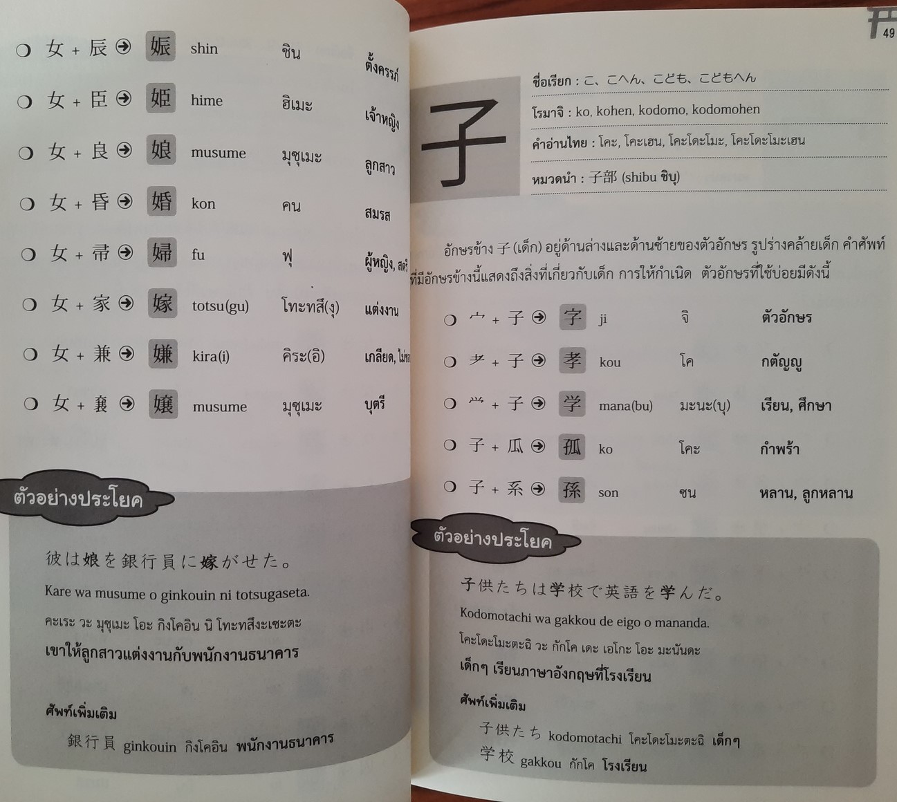 มีตัวอย่างคำศัพท์ที่เกิดจากการประกอบกันของตัวอักษร คำศัพท์ประสม ตัวอย่างประโยค เพื่อให้ผู้เรียนได้เข้าใจอักษรข้างและเรียนรู้คำศัพท์ไปพร้อม ๆ กัน