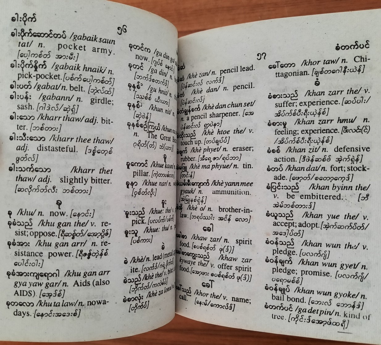 พจนานุกรมพม่า-อังกฤษ ฉบับพกพา (The Thalun Myanmar - English Pocket Dictionary) ได้คัดเลือกเฉพาะคำสำคัญและใช้บ่อย และแปลจากภาษาพม่าเป็นภาษาอังกฤษ จัดทำขึ้นเพื่อผู้ที่เรียนภาษาอังกฤษ