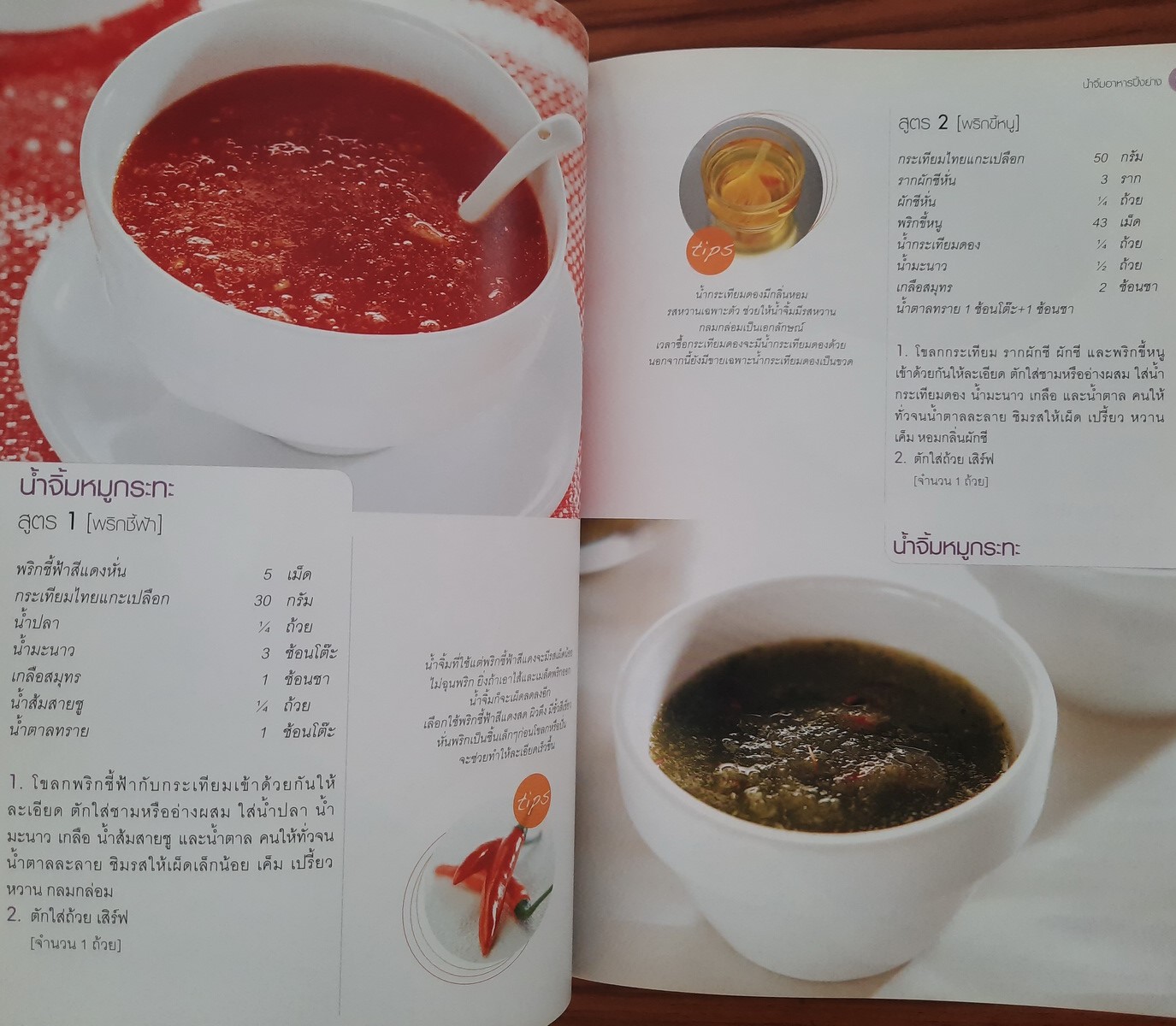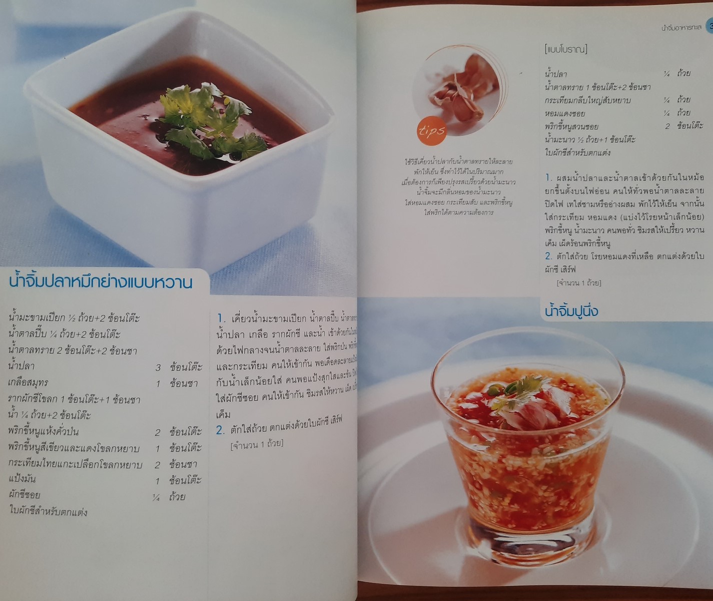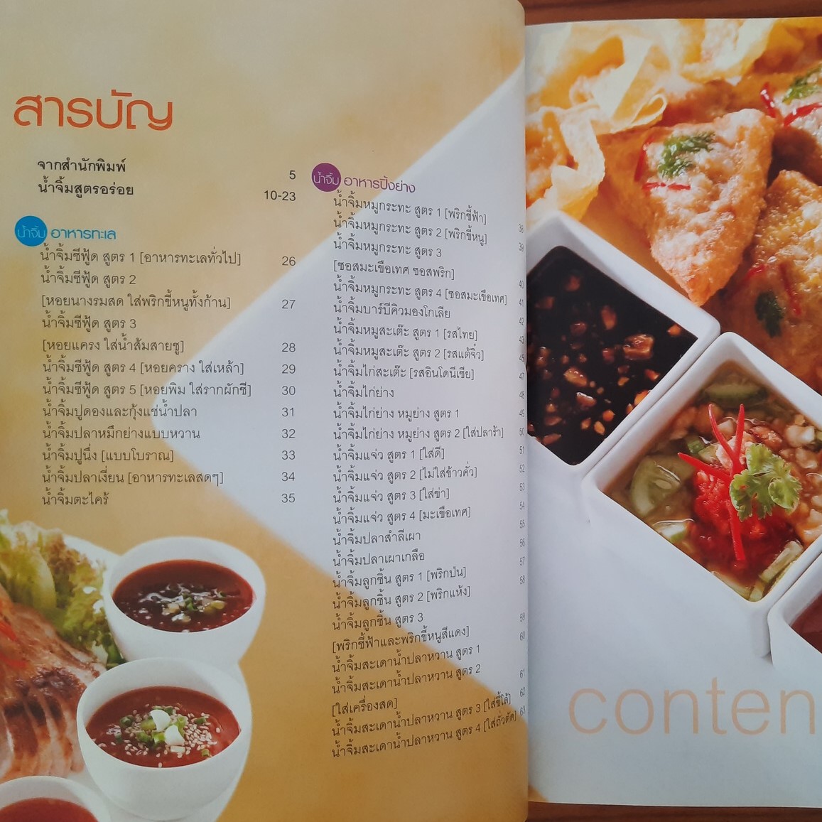 ในเล่มน้ำจิ้มนี้ มีน้ำจิ้มมากถึง 121 สูตร เรียกว่ามีน้ำจิ้มครบทุกจานอาหาร นับตั้งแต่อาหารทะเล อาหารจานเดียวหลายอย่าง อาหารทอดและอาหารว่าง อาหารนึ่งและหม้อไฟ อาหารปิ้งย่าง และน้ำปลาหวานจิ้มมะม่วงดิบรสเปรี้ยวสารพัดชนิด ไม่เว้นแม้แต่น้ำจิ้ม ตือคาโคว มันแขก และน้ำจิ้มบ๊วยเจี่ยที่ใช้จิ้มกับแฮ่กึ๊น ฮ่อยจ๊อ