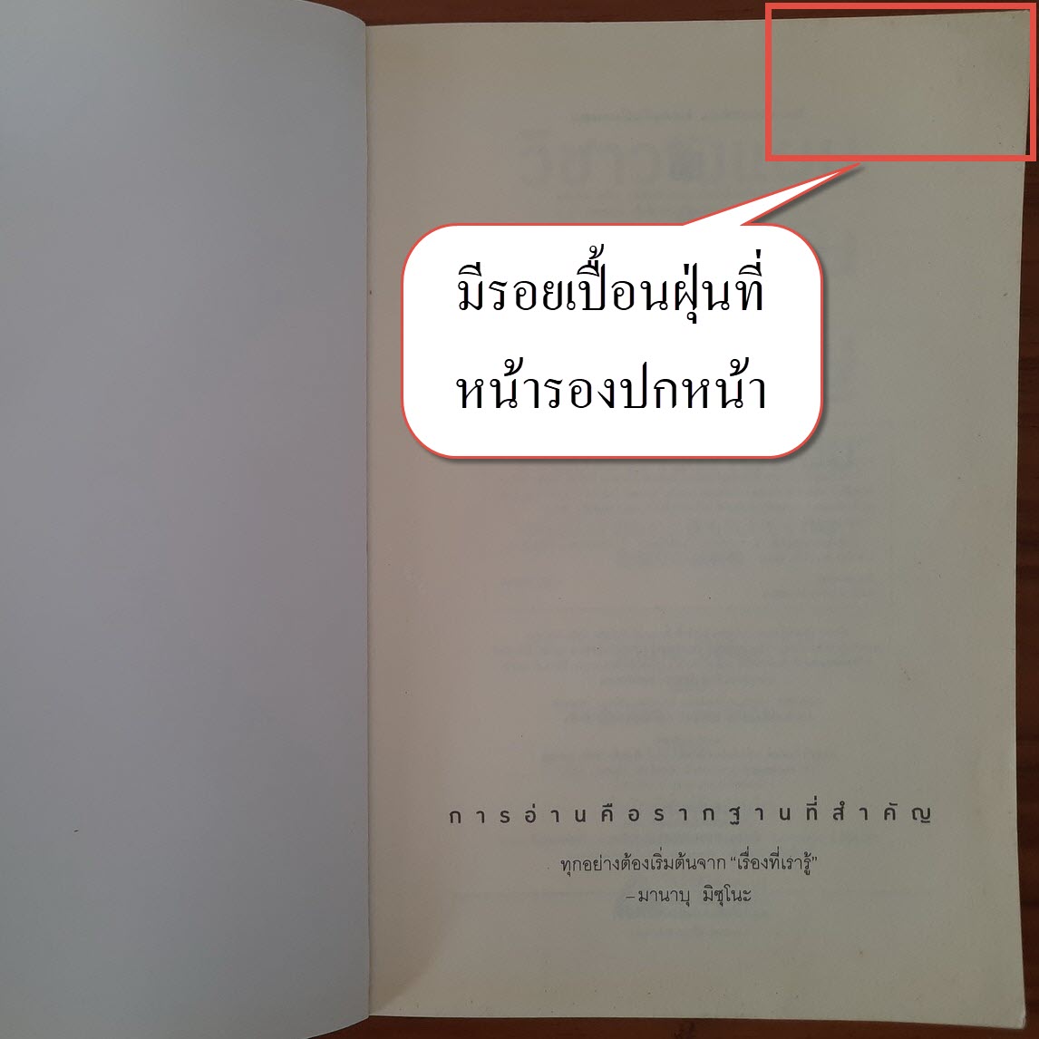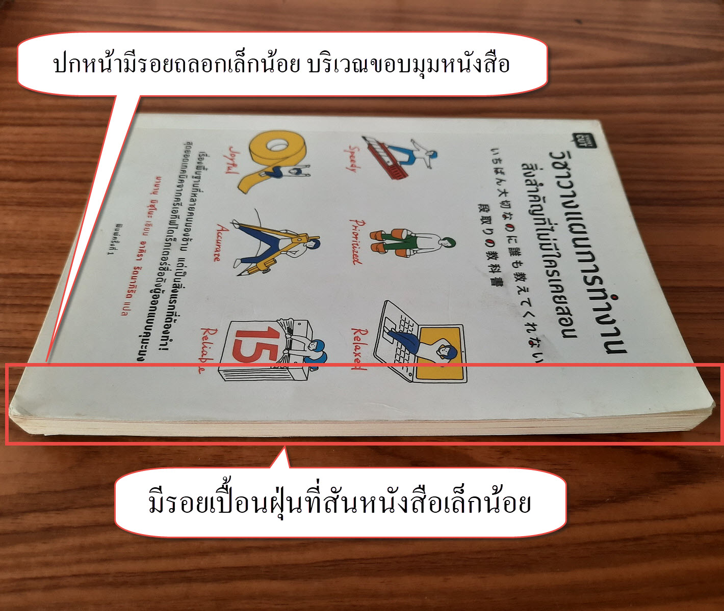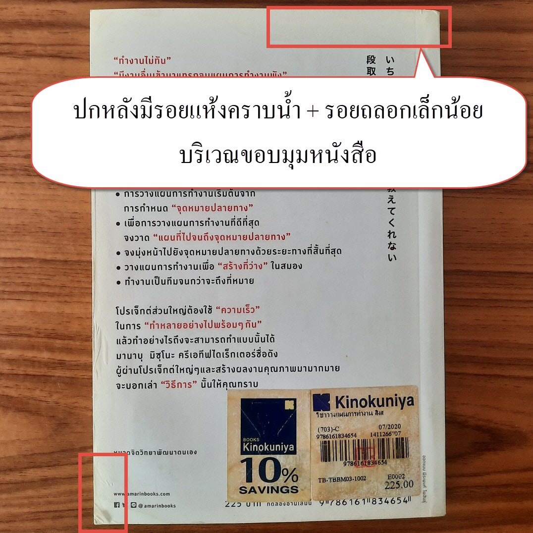 (2) ปกหน้า/ปกหลัง มีรอยแห้งคราบน้ำ + รอยถลอกเล็กน้อยบริเวณขอบมุมหนังสือ รายละเอียดตามภาพ