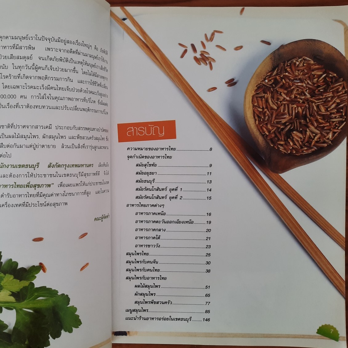 ฝ่ายสิ่งแวดล้อม สำนักงานเขตธนบุรี สังกัดกรุงเทพมหานคร เล็งเห็นถึงประโยชน์ของการสืบสาน และต้องการให้ประชาชนในเขตธนบุรีมีสุขภาพที่ดี จึงได้จัดทำหนังสือ "สมุนไพร อาหารไทยเพื่อสุขภาพ" เพื่อเผยแพร่ให้แก่ประชาชนในเขตธนบุรี มีความรู้และเข้าใจในตำรับอาหารไทยที่มีคุณค่าทางโภชนาการที่สูง และในความหลากหลายของสมุนไพร และเครื่องเทศที่มีประโชน์ต่อสุขภาพ