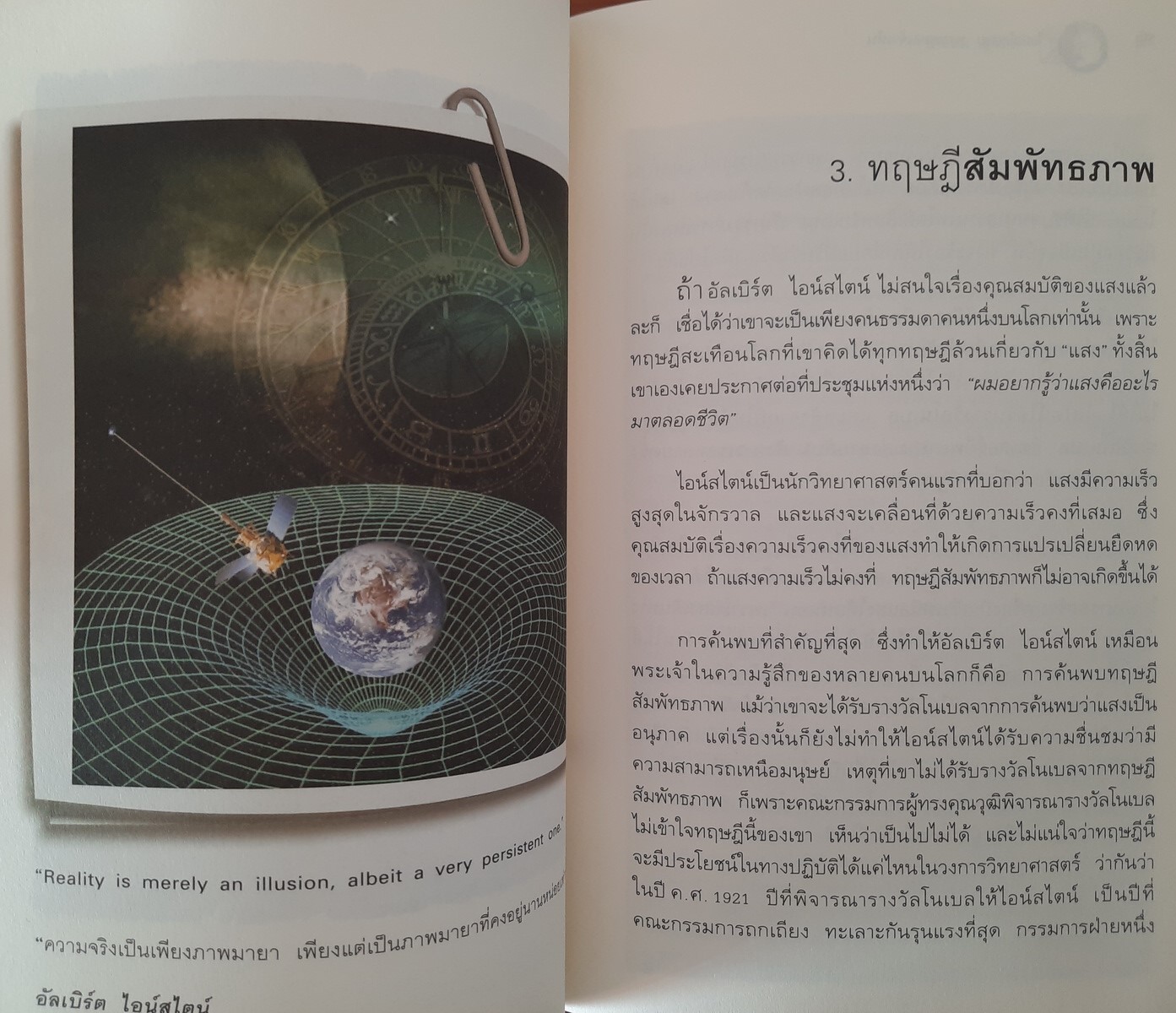 "อัลเบิร์ต ไอน์สไตน์" เป็นผู้ที่มีแนวคิดและมีการค้นพบทฤษฎีต่างๆ ทางวิทยาศาสตร์ที่ลึกลับและซับซ้อนเป็นอย่างยิ่ง สร้างปรากฏการณ์ใหม่ และลบล้างความเชื่อเก่าๆ ลงโดยสิ้นเชิง การค้นพบของพระพุทธเจ้าเป็นการค้นพบทางนามธรรม ยากต่อการพิสูจน์ แต่การพบทางวิทยาศาสตร์ฟิสิกส์ ไม่ว่าจะเป็น สสาร พลังงาน จักรวาล ปรมาณู การยืดหดของเวลา ของไอน์สไตน์ กลับช่วยให้การค้นพบส่วนหนึ่งของพระพุทธเจ้าได้รับการพิสูจน์และยืนยันทางคณิตศาสตร์อย่างไม่น่าเชื่อ