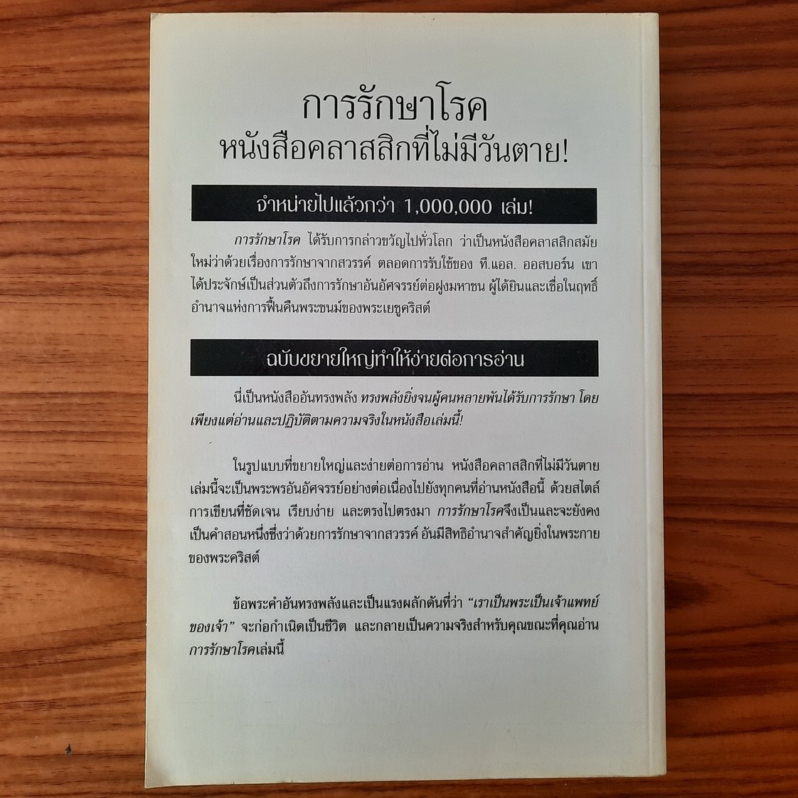 ในรูปแบบที่ขยายใหญ่และง่ายต่อการอ่าน หนังสือคลาสสิกที่ไม่มีวันตายเล่มนี้จะเป็นพระพรอันอัศจรรย์อย่างต่อเนื่องไปยังทุกคนที่อ่านหนังสือนี้ ด้วยสไตล์การเขียนที่ชัดเจน เรียบง่าย และตรงไปตรงมา การรักษาโรคจึงเป็นและจะยังคงเป็นคำสอนหนึ่งซึ่งว่าด้วยการรักษาจากสวรรค์ อันมีสิทธิอำนาจสำคัญยิ่งในพระกายของพระคริสต์