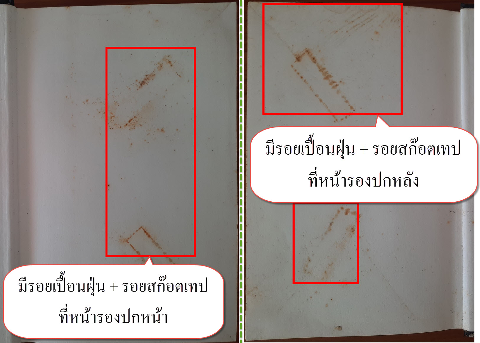 (2) ใบหุ้มปก มีรอยเปื้อนฝุ่น + รอยถลอกขาดเล็กน้อย (ใช้สก็อตเทปซ่อมให้แล้ว) รายละเอียดตามภาพ