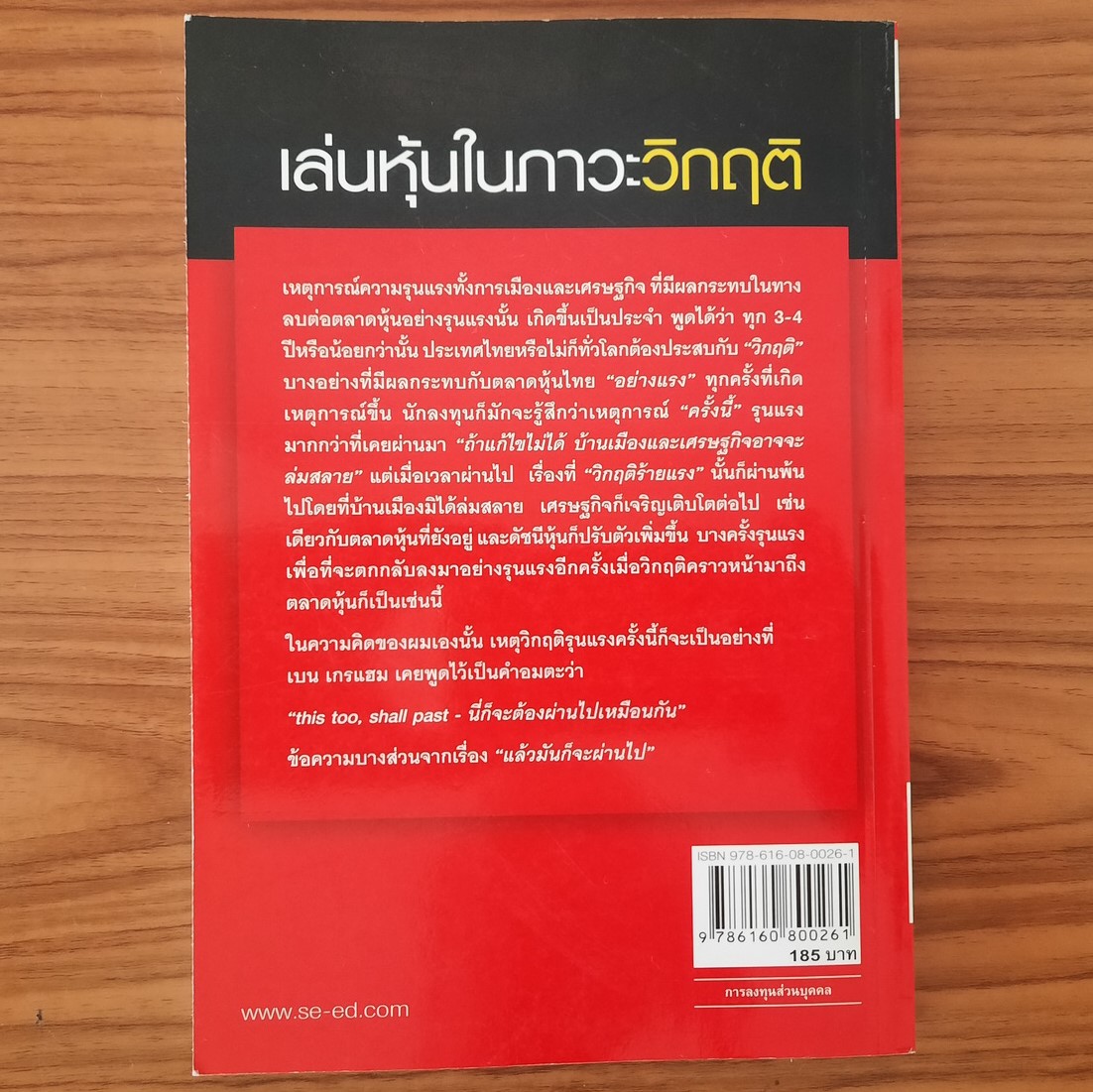 รวมสารพัดกลยุทธ์การเล่นหุ้นในยุควิกฤตเศรษฐกิจ ถ่ายทอดจากประสบการณ์ตรงของผู้เขียน ซึ่งเป็น Value Investor หมายเลขหนึ่งของเมืองไทย หนังสือเล่มนี้จะเป็นคู่มือที่ดีให้กับนักลงทุนทั้งหน้าเก่าและหน้าใหม่ ให้สามารถนำความรู้ที่ได้ ไปผสมผสานกับการวิเคราะห์ตามหลักทฤษฎี เพื่อพัฒนาทักษะการลงทุนให้ก้าวหน้า และช่วยลดความเสี่ยงในการเล่นหุ้นของคุณ