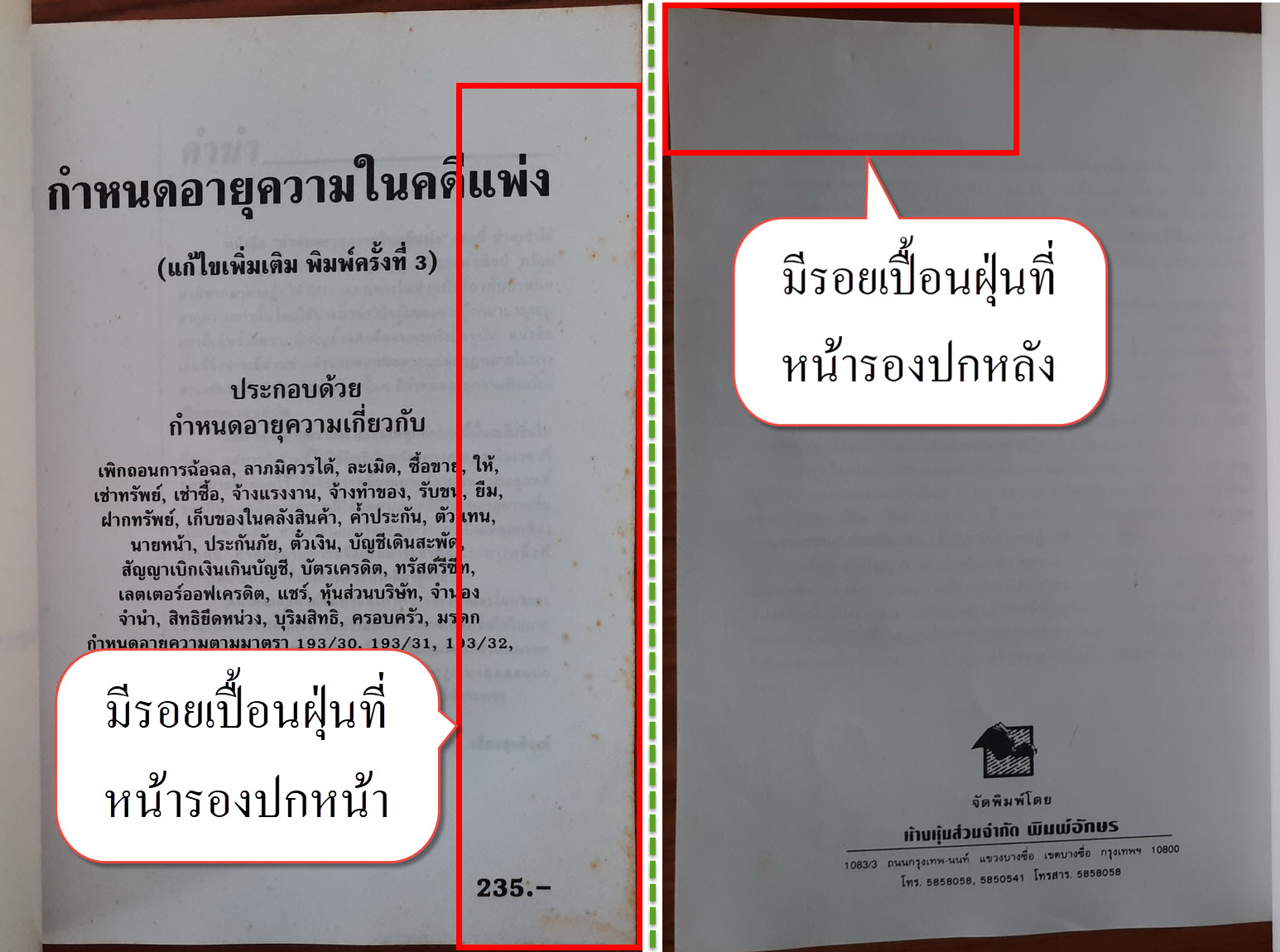 หนังสือเล่มนี้จึงน่าจะมีส่วนช่วยอำนวยความสะดวกแก่นักกฎหมายในการตรวจค้นว่า สิทธิเรียกร้องในเรื่องนั้นๆ มีกำหนดอายุความฟ้องร้องเป็นระยะเวลาเท่าใด