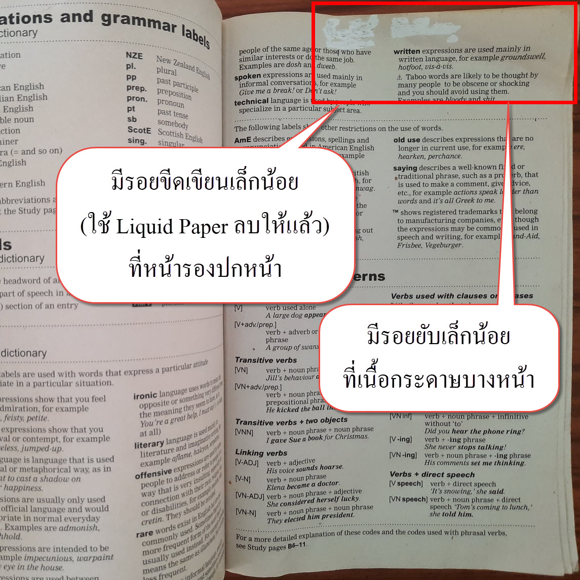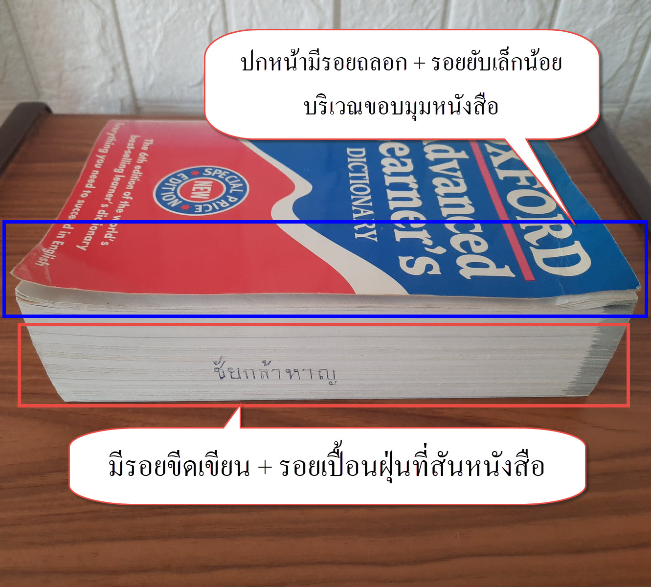 (2) มีรอยขีดเขียนที่สันหนังสือ และหน้ารองปกหน้า (ไม่กระทบเนื้อหาหนังสือ) ไม่มีรอยขีดเขียนที่จุดอื่นอีก รายละเอียดตามภาพ