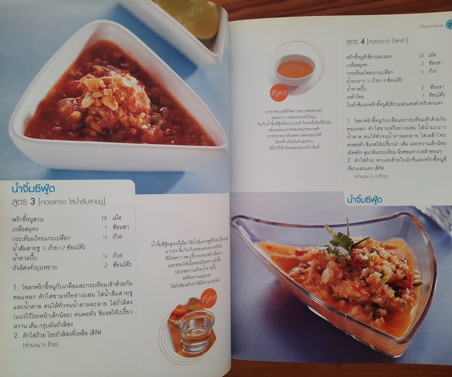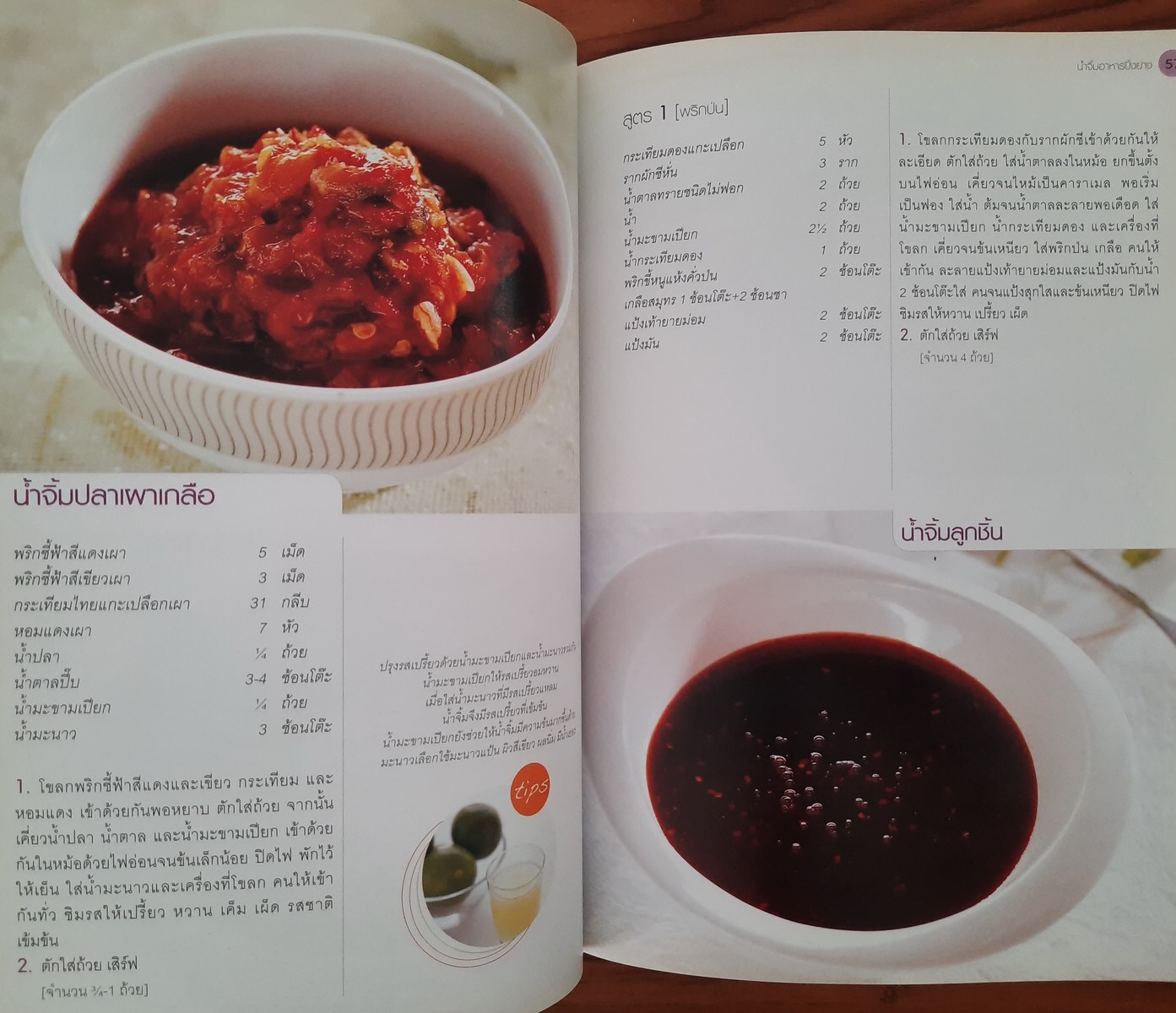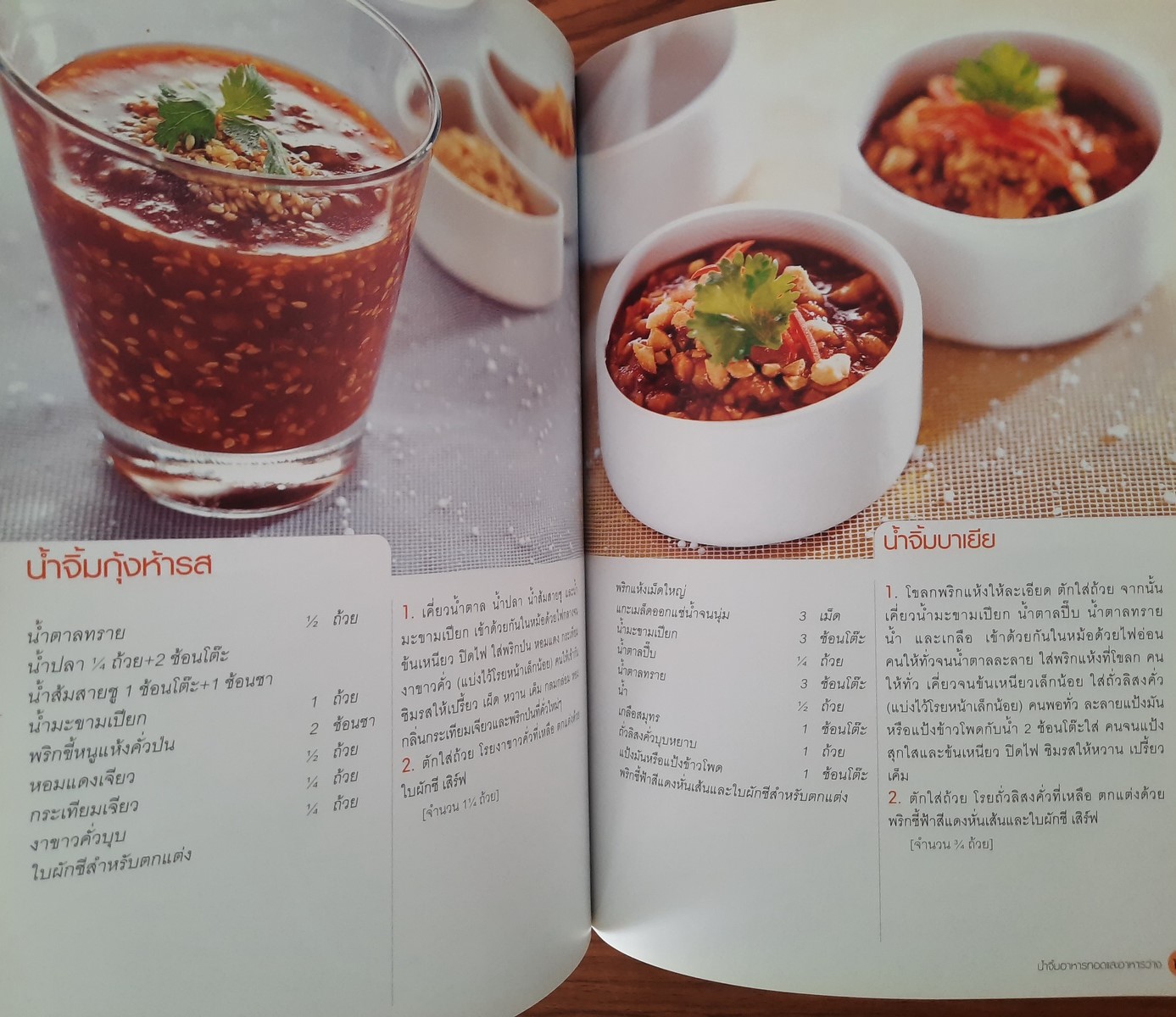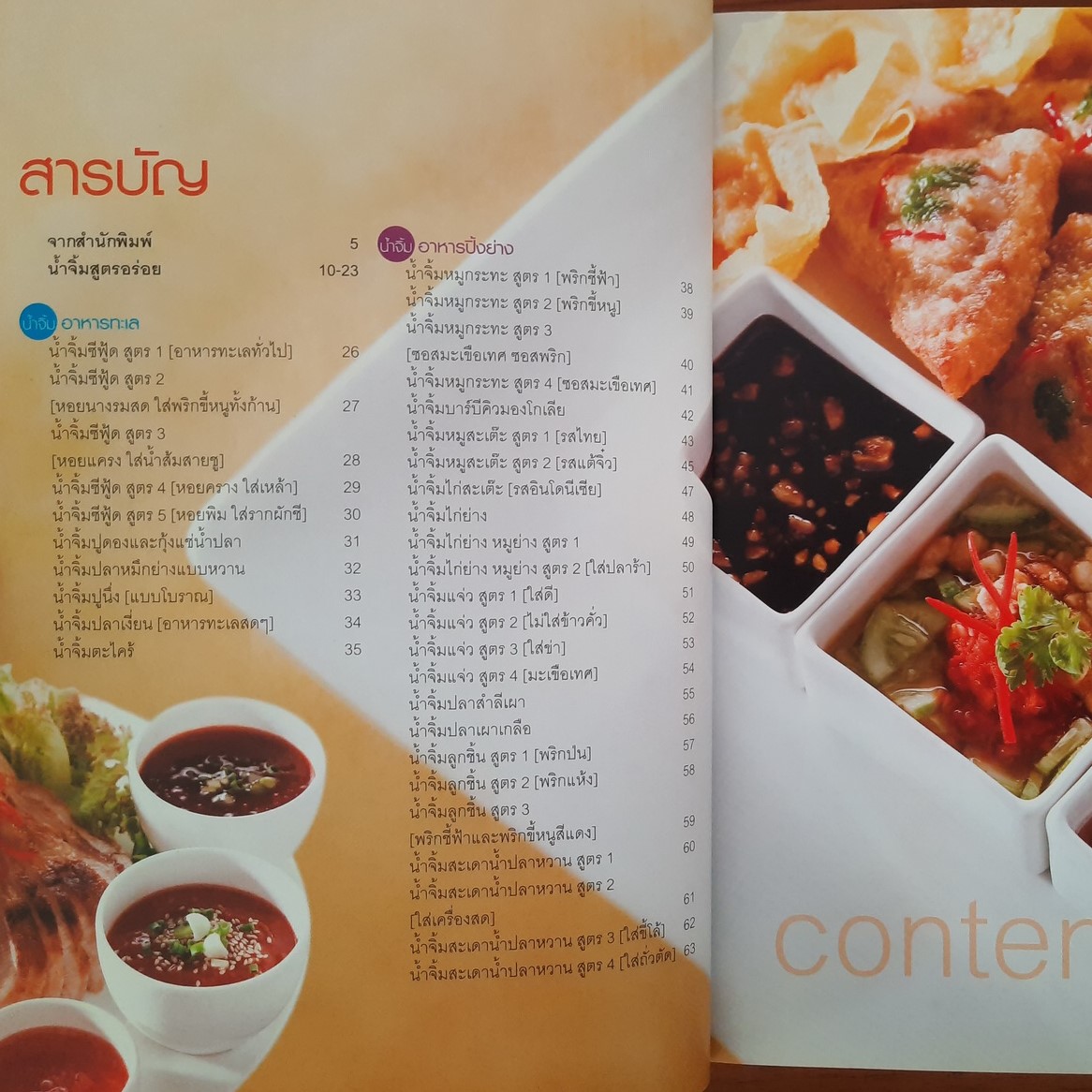 ในเล่มน้ำจิ้มนี้ มีน้ำจิ้มมากถึง 121 สูตร เรียกว่ามีน้ำจิ้มครบทุกจานอาหาร นับตั้งแต่อาหารทะเล อาหารจานเดียวหลายอย่าง อาหารทอดและอาหารว่าง อาหารนึ่งและหม้อไฟ อาหารปิ้งย่าง และน้ำปลาหวานจิ้มมะม่วงดิบรสเปรี้ยวสารพัดชนิด ไม่เว้นแม้แต่น้ำจิ้ม ตือคาโคว มันแขก และน้ำจิ้มบ๊วยเจี่ยที่ใช้จิ้มกับแฮ่กึ๊น ฮ่อยจ๊อ
