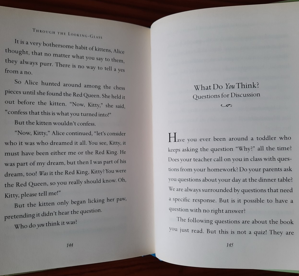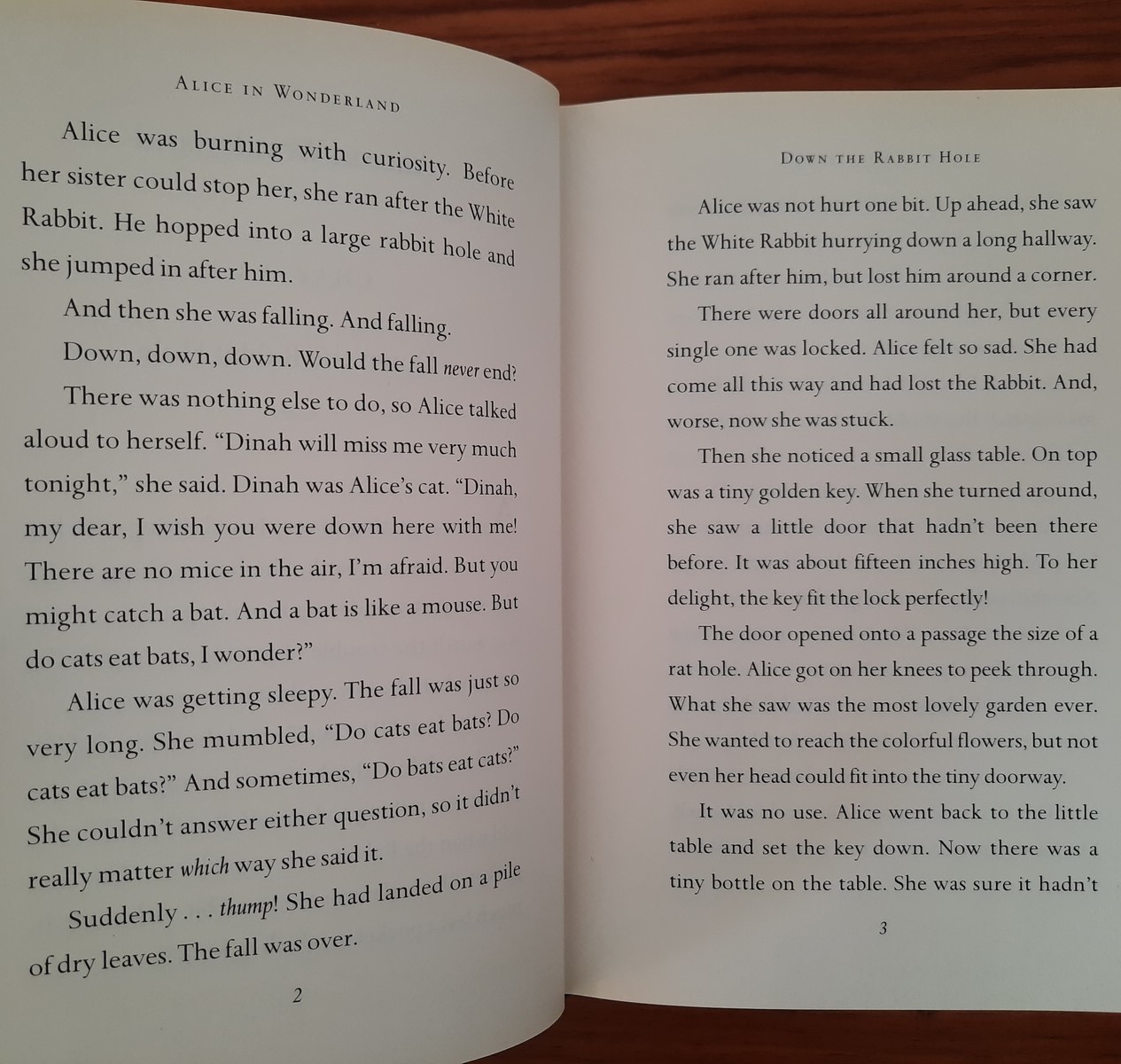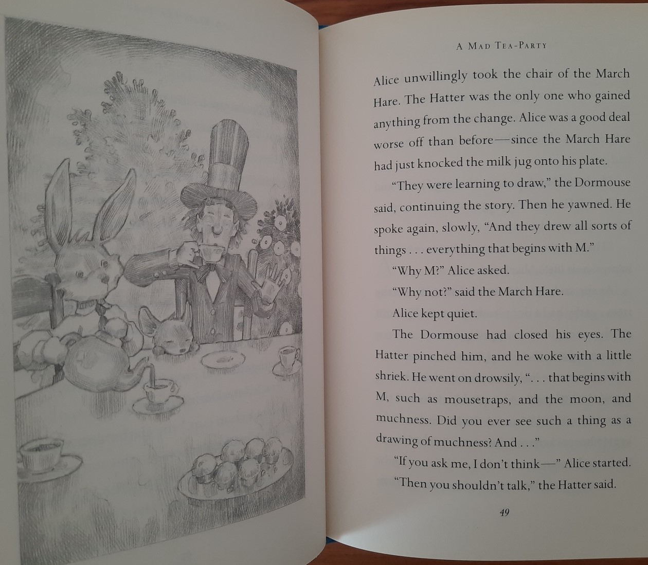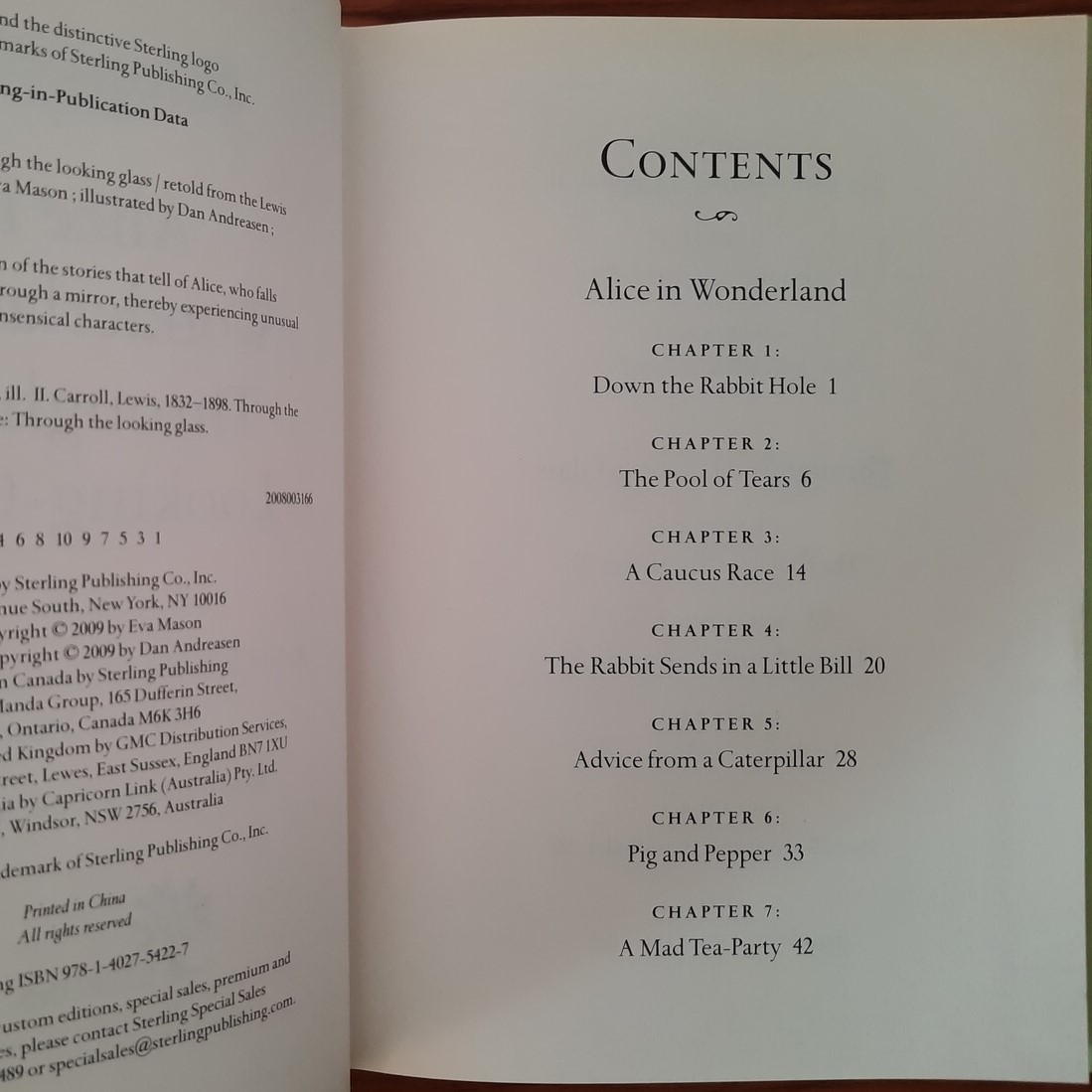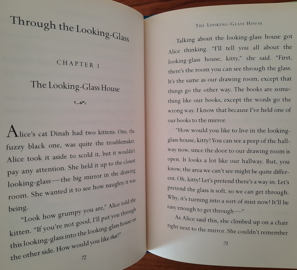 She shrinks and grows larger, receives directions from a grinning cat, attends a mad tea-party, and plays an extraordinary game of croquet. Then, after stepping through a mirror,